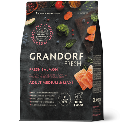 Беззерновой корм с живыми пробиотиками GRANDORF Fresh Adult MEDIUM & MAXI Salmon & Sweet Potato (Свежее филе лосося с бататом для собак средних и крупных пород) 10 кг
